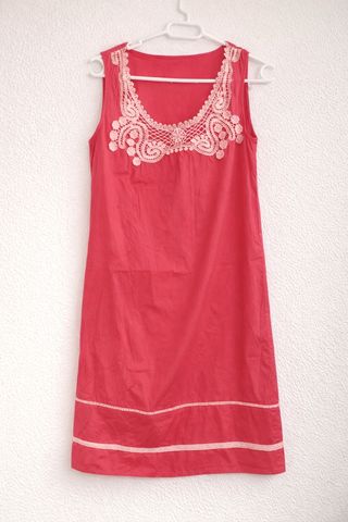Vestido color coral muy favorecedor con detalle de encaje en el escote que le da un toque elegante y femenino. Diseño sin mangas, fresco y cómodo, ideal para verano, paseo, vacaciones o eventos informales. Corte recto con detalle decorativo en la parte inferior. En buen estado.