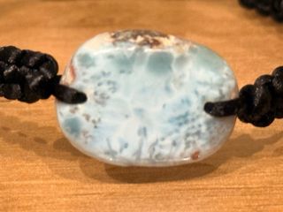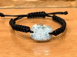 Pulsera artesanal con una piedra natural de Larimar. El cordón es negro y ajustable. - Piedra de Larimar con tonos azules y blancos. - Cierre de macramé. - Cordón de nylon resistente.