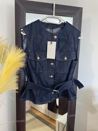 Chaleco vaquero de Zara con cinturón. - Diseño sin mangas. - Cierre de botones. - Dos bolsillos en el pecho. - Cinturón a juego.