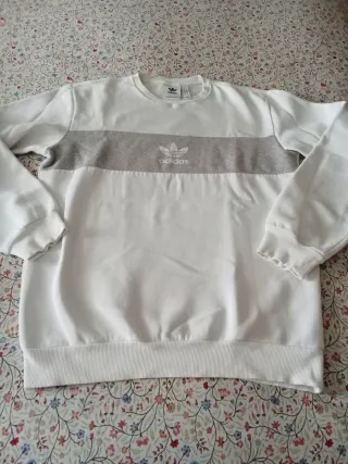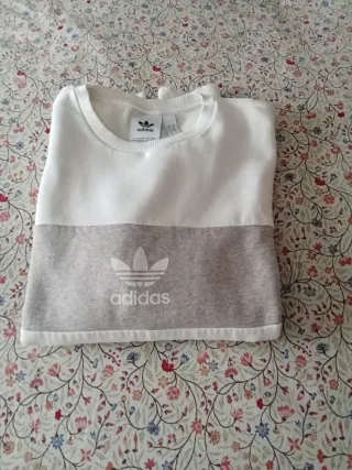 Sudadera de Adidas con un diseño moderno y cómodo. - Parte superior blanca. - Banda central gris con logo. - Cuello redondo. Talla. S amplia