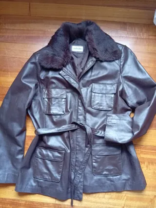 Elegante chaqueta de piel con un suave cuello de pelo. - Confeccionada en 100% piel de cerdo. - Cuello de pelo de conejo. - Diseño con cinturón para ajustar la cintura. - Múltiples bolsillos frontales.