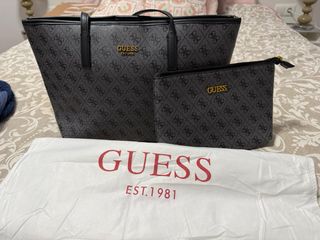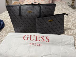 Conjunto de bolso y neceser de la marca Guess. - Diseño con monograma. - Incluye neceser a juego. Pequeños desperfectos en las esquinas del bolso de apoyarlo, se ve en últimas fotos