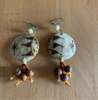 Pendientes hechos a mano con un diseño único. - Círculos de material natural con grabado. - Colgantes de cuentas de madera y detalles. - Cierre de anzuelo metálico.