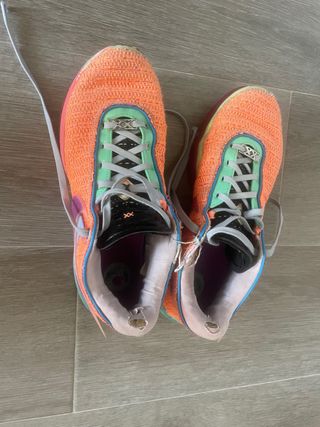 Zapatillas Nike LeBron XX en llamativos tonos naranjas y multicolor. Diseñadas para un estilo deportivo y moderno. - Parte superior de tejido transpirable. - Detalle de cordones grises y ojales verdes. - Suela con diseño distintivo.