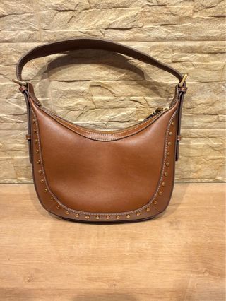 Bolso de mano de la marca Mango en color marrón. Un accesorio elegante y moderno. Nuevo - Diseño con tachuelas metálicas. - Asa de hombro regulabre - Cierre de cremallera. Bolsillo interior