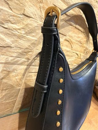 Elegante bolso negro de la marca Mango, con un diseño moderno y detalles que marcan la diferencia. Original Nuevo - Adornado con tachuelas doradas. - Asa cómoda para llevar al hombro. Regulable - Cierre de cremallera superior. Bolsillo interior