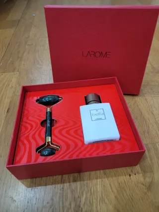 Set de regalo de Larome para mujer, incluye un perfume y un rodillo facial. - Fragancia femenina. - Rodillo facial con detalles dorados y piedra oscura. - Presentado en caja roja.