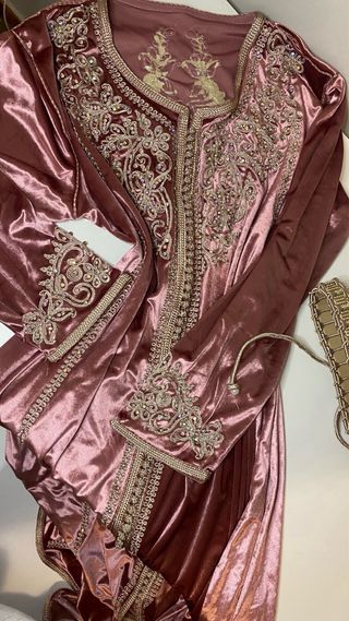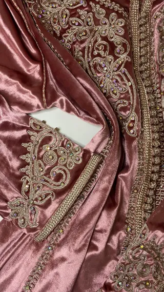Elegante kaftán marroquí con detalles bordados y pedrería. - Tejido de terciopelo suave. - Bordados intrincados en hilo dorado. - Adornos de pedrería brillante. - Diseño tradicional marroquí.