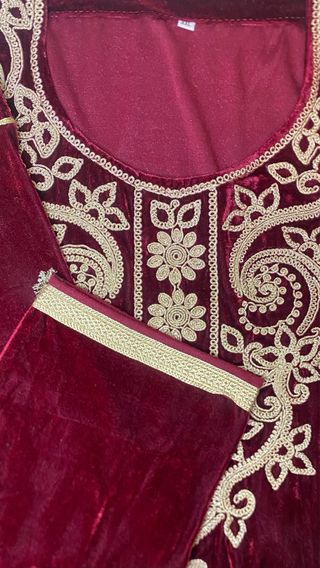 Elegante vestido marroquí con detalles bordados. - Tejido de terciopelo. - Bordado dorado en el cuello y mangas. - Detalle de pasamanería dorada en los bordes.