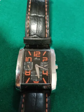 Reloj Lotus modelo 15387 con correa de piel. - Correa de piel negra con pespuntes. - Esfera negra con detalles naranjas. - Indicadores de día y fecha.