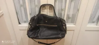 Elegante bolso de piel en color negro, con detalles de tachuelas doradas y cadena. - Cierre principal con cremallera. - Bolsillo exterior con cremallera. - Asa de mano y correa de cadena. - Logo metálico de la marca en la parte frontal.
