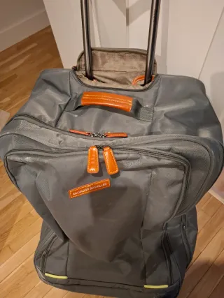 Maleta de viaje de la marca Salvador Bachiller. - Color verde caqui con detalles en cuero - Asa superior y tiradores de cremallera en cuero. - Compartimento frontal con cremallera - Tiene dos ruedas - Medidas: alto 73, fondo 30, ancho 46