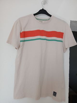 Camiseta de manga corta con un diseño de rayas. - Raya ancha de color naranja. - Raya fina de color verde. - Cuello redondo. Cada uno por 6€