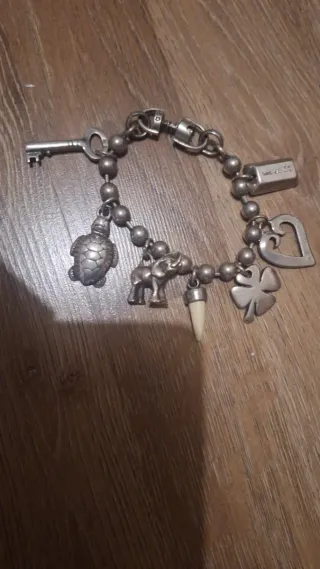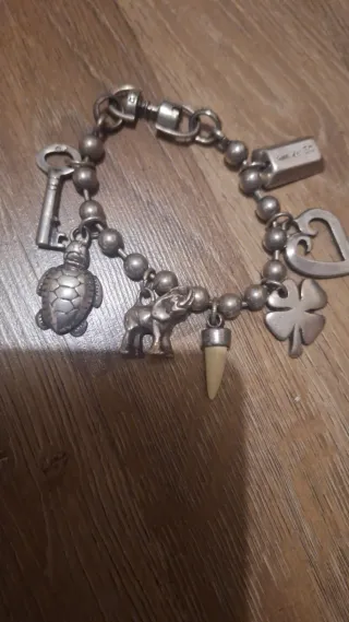 Pulsera de la marca Uno de 50 con varios charms. - Charm de llave - Charm de tortuga - Charm de elefante - Charm de trébol de cuatro hojas - Charm de corazón - Charm de colmillo - Cierre de mosquetón
