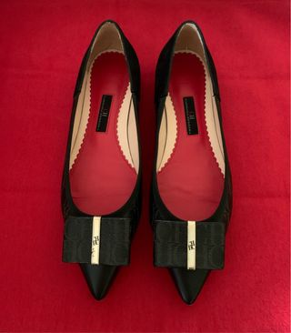 Elegantes y atemporales manoletinas de Carolina Herrera, confeccionadas de alta calidad con un diseño clásico en color negro. Cuentan con detalles acolchados y costuras en contraste que le aportan un toque sofisticado, además de la icónica insignia dorada “CH” en la parte delantera. El modelo incluye un delicado lazo decorativo, y la plantilla en color rojo añade un toque distintivo y lujoso, característico de la marca. • Talla: 38 • Incluye caja