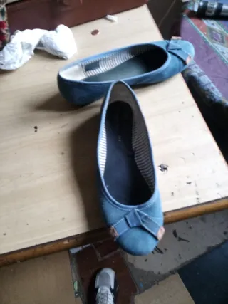 Manoletinas de mujer en color azul. Material , piel vuelta - Talla 38. - Diseño con lazo. - Interior a rayas.