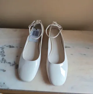 Elegantes bailarinas de Mango con un acabado brillante que imita el charol. Un calzado versátil y cómodo. Con caja incluida. Fue un regalo de Reyes y no me valen, ningún uso. - Diseño de punta fina. - Correa ajustable en el tobillo con hebilla dorada. - Tacón bajo y fino.