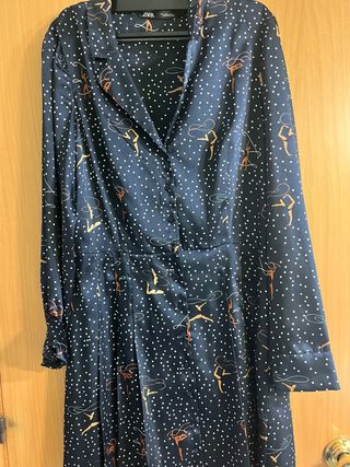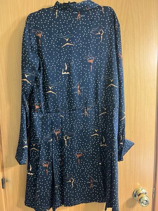 Vestido largo con estampado de bailarinas y lunares. - Diseño con cuello camisero. - Cierre de botones. - Manga larga. - Bajo con vuelo.