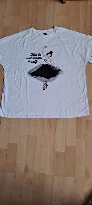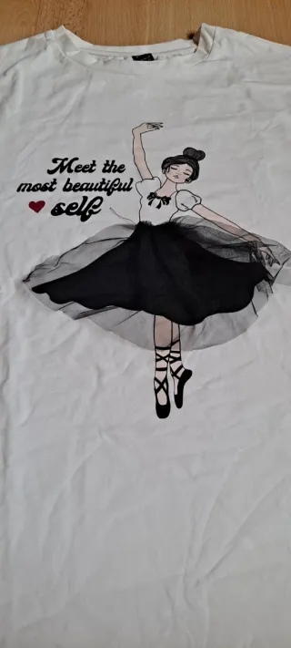 Camiseta blanca con un diseño de bailarina y un mensaje inspirador. - Ilustración de bailarina con tutú negro. - Mensaje Meet the most beautiful self con un corazón rojo. - Sisa 62, largo 69 Oversice - Manga corta y cuello redondo.