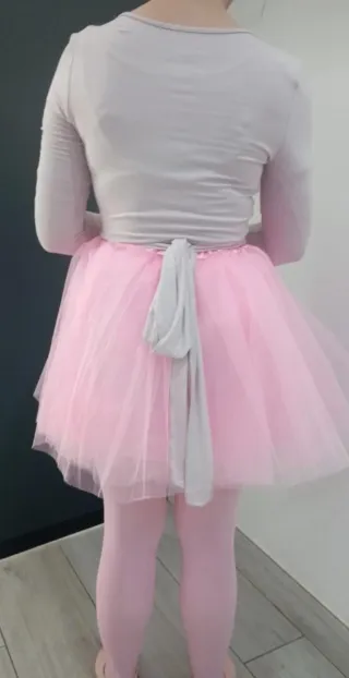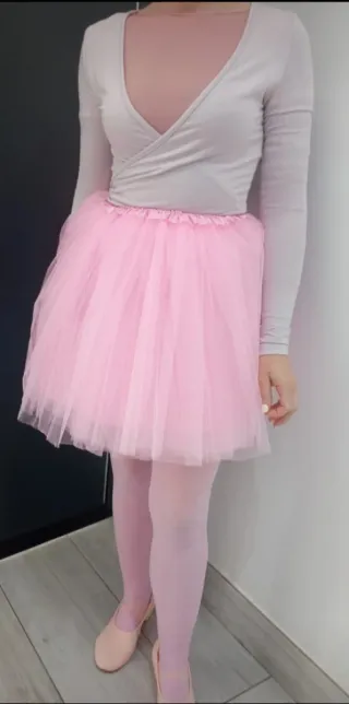 Conjunto completo de bailarina para adulto. Ideal para actuaciones o disfraces. Talla XS y bailarinas talla 36 - Tutú rosa de tul. - Maillot gris de manga larga. - Medias rosas. - Zapatillas de ballet rosas.
