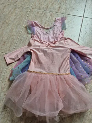 Talla 2-4 años Precioso vestido de bailarina con un diseño encantador. - Cuerpo de manga larga en color rosa satinado. - Falda de tul con brillo y detalles de estrellas. - Mangas y detalles en el cuello con tul de colores arcoíris y estrellas doradas.