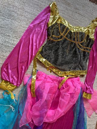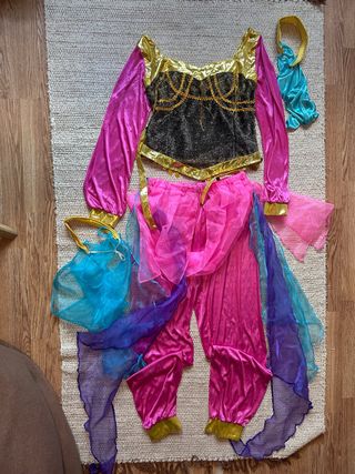 Este disfraz inspirado en Jazmín es perfecto para fiestas temáticas o disfraces. Estilo oriental / genio / bailarina árabe, con colores vibrantes y telas brillantes. Ideal para carnaval - Parte superior con detalles dorados y pedrería. - Mangas largas y pantalón tipo bombacho. - Incluye cinturón y velos de colores. - Adornos dorados en puños y cintura.