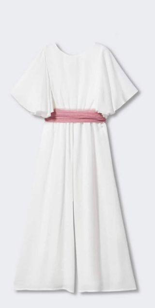 Precioso conjunto para comunión de niña. - Diseño de mono en blanco. Talla 12 - Cinturón decorativo en tono rosa. - Mangas tipo capa. - Zapatos tipo bailarina en rosa palo con cintas - Bolero en rosa palo talla 12