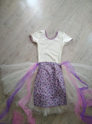 Precioso conjunto de baile para niñas, ideal para practicar ballet o para disfraces. Precio no negociable. - Cuerpo de manga corta blanco con ribete morado. - Falda tipo tutú con varias capas de tul blanco y detalles en morado y rosa. - Braguita a juego con estampado floral.
