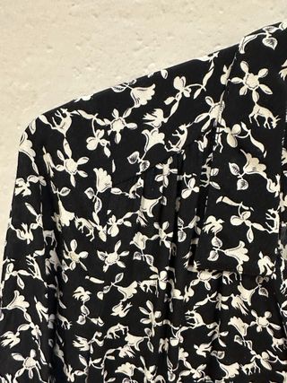 Vestido con un estampado único de bailarinas y estrellas. - Diseño con cuello camisero. - Manga larga. - Cintura fruncida con caída. - Estampado en negro y blanco.