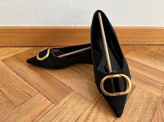 Usadas dos veces. Me las regalaron y me quedan pequeñas. Talla 37. Manoletinas planas, negras con broche, puntera afilada, sin cierres. Precio original: 35,99€