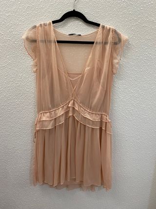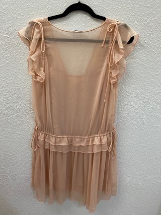 Vestido mini rosa de mango . Escote en pico con tela ligera de gasa semitransparente . Lleva vestido forro interior. Ajustable a la cintura. Estilo bailarina. En perfecto estado. Solo puesto en un par de ocasiones. Con mini volantes en las mangas. #vestidomujer