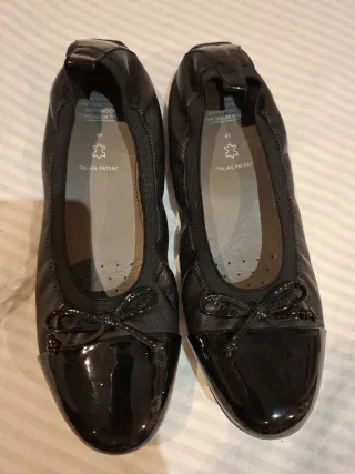 Manoletinas de la marca Geox en color negro y talla 41. - Diseño elegante con detalle de lazo. - Acabado charol en la puntera y trasera - Materiales de calidad. Una puesta