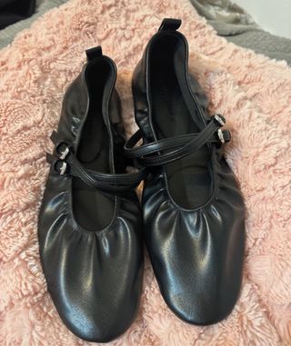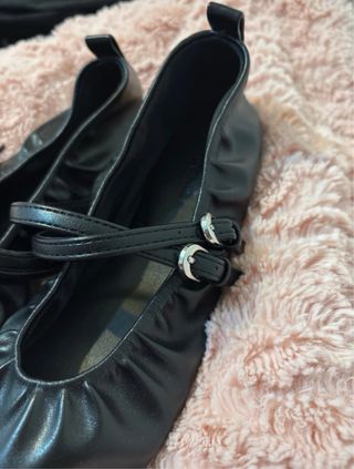 Elegantes bailarinas negras con un diseño moderno. - Material sintético. - Cierre con tiras y hebilla. - Detalle fruncido en la punta.