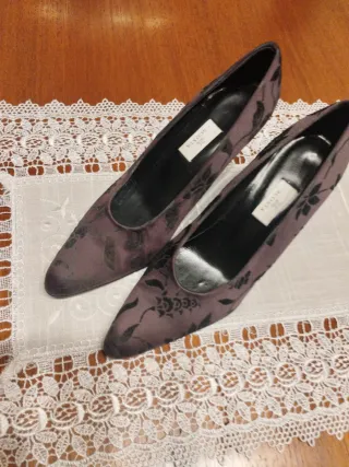 Elegantes zapatos de tacón con un diseño floral. - Material: raso y terciopelo. - Color: violeta. - Talla: 37.5.