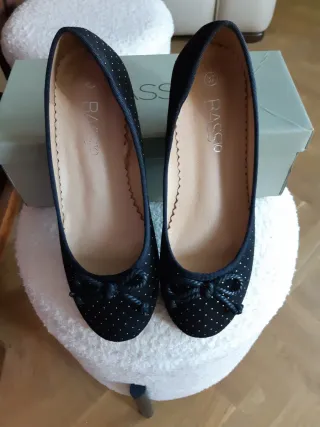 Elegantes bailarinas de la marca Wonders. - Color azul marino con detalles dorados en el interior. - Adorno de flecos y lazo en la puntera. - Talla 37. -Tacones de Primark de regalo