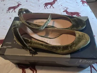 Bailarinas de terciopelo en un bonito tono verde. Cuentan con una tira al tobillo para un ajuste seguro. Talla 37. Massimo Dutti.