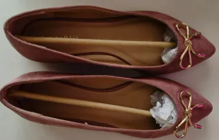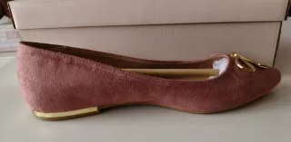 Elegantes bailarinas en tono rosa, perfectas para añadir un toque de color a tu look. - Diseño con puntera afilada. - Adorno de lazo dorado en la parte delantera. - Material exterior tipo ante.