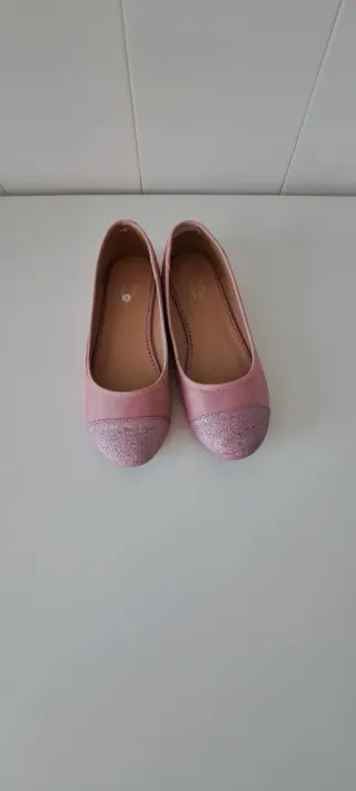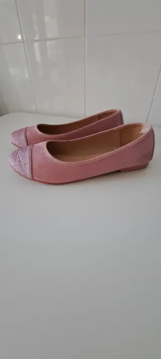 Elegantes bailarinas de piel en tono rosa, perfectas para añadir un toque de brillo a tu look. Tienen una pequeña mancha en un lateral, como se puede apreciar en la fotografía. - Detalle de glitter en la puntera y el parte trasera. - Material exterior de piel. - Diseño de bailarina clásico.