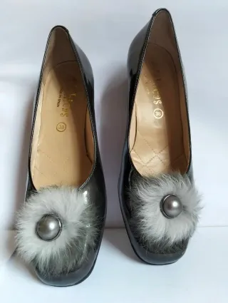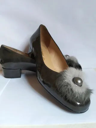 Elegantes bailarinas de la marca D'Chicas con un detalle de pompón gris en la puntera. El tacón mide 3 cm - Diseño brillante en color negro. - Adorno de pompón con perla central. - Talla 38.
