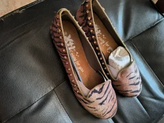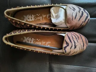 Manoletinas con un llamativo estampado animal print y detalles de tachuelas doradas. La talla es 38 que es mi número pero es muy pequeño no me entra, yo diría que es una 37 está mal tallada. - Diseño de punta fina. - Ribete decorativo en el borde. - Interior con inscripción Crazy for you.