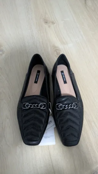 Manoletinas de Stradivarius en color negro y talla 38. Presentan un diseño acolchado con detalle de cadena. - Diseño acolchado con pespuntes en forma de V. - Adorno de cadena metálica en la pala. - Logo de la marca en la plantilla.