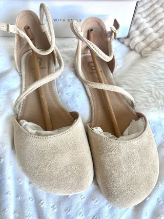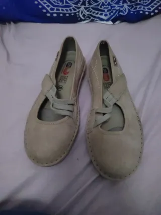 Bailarinas de piel en color beige, talla 38. Un calzado cómodo y elegante. Están nuevos sin estrenar - Cierre con tira. - Suela flexible. Tiene una marchita marrón en la punta, que se puede arreglar poniendo un betún mas oscurito.
