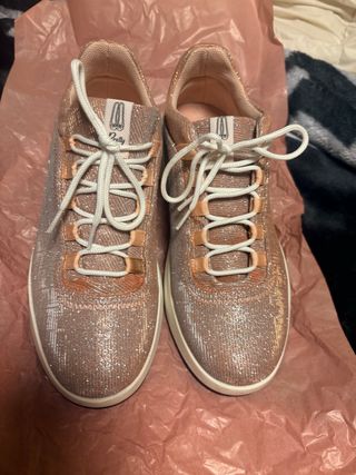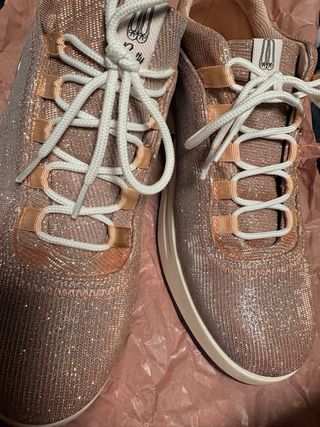 Zapatillas Pretty Ballerinas con un diseño brillante y elegante. - Acabado metalizado en tonos dorados y rosados. - Cordones blancos. - Suela blanca. Usada solo una hora