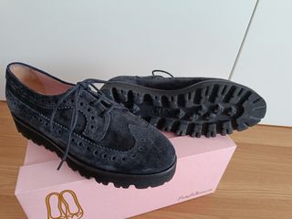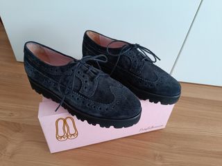 Zapato inglés de cordones de la marca Pretty Bailarinas. Color azul oscuro, de ante. Todo piel. Talla 38