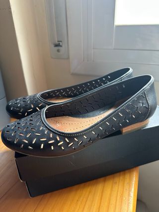 Preciosas bailarinas Clarks de color negro y talla 38. Están en muy buen estado. - Diseño elegante y atemporal. - Perforaciones con detalle decorativo. - Cómodas y perfectas para el día a día. - Se venden dos bailarinas.