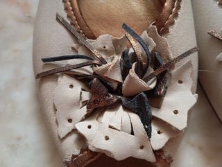 Bailarinas usadas solo para un bautizo. Talla 38 de la marca Esteba Baix. Tiene una flor delante hecha de la misma tela de las zapatillas