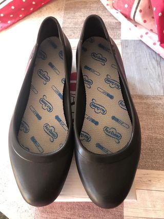 Bailarinas de ante negro, marca Mango, talla 40 (tallan un poco más). Les puse una sobresuela para aislar mejor del suelo, que no pesa nada y da mayor comodidad. Se ha despegado un poquito en la punta de una bailarina. Llevadas siempre con plantilla interior.
