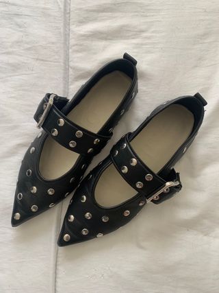 Talla 40 Tienen desgaste en la punta a pesar de que se han utilizado 3 veces, por lo demás están nuevas. Cuero con tachuelas estilo Ganni. precio 180 euros Envío con Inpost