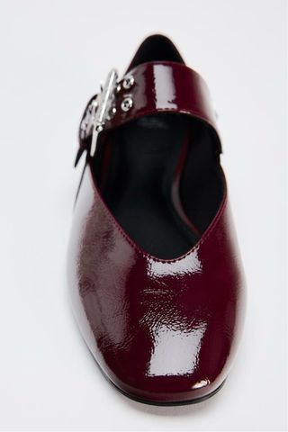 Elegantes bailarinas de Zara en color burdeos. Un calzado versátil y cómodo. - Diseño con tira y hebilla dorada. - Material tipo ante.