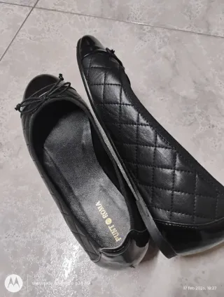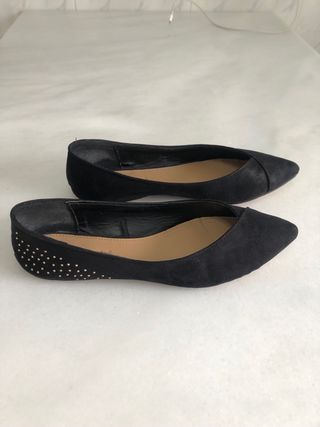Elegantes bailarinas de mujer con un diseño clásico y un toque moderno. - Color negro. - Adornadas con pequeñas tachuelas plateadas. - Punta fina. - Puestas 1 día. - Las cogí muy grandes, me hacía falta una talla menos.